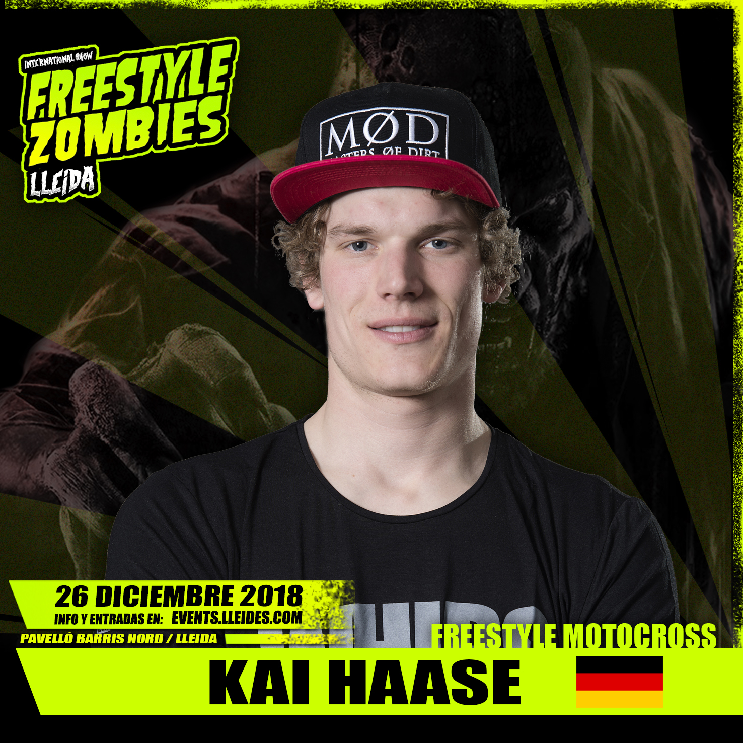 El Freestyle Zombies, que se celebrará el próximo 26 de diciembre en el pabellón Barris Nord de Lleida, contará con un elenco de lujo en general y en lo que concierne a los pilotos de FMX en particular. El último en añadirse a un laureado y extenso grupo es el mundialista Kai Haase. El alemán ha sido uno de los iconos en los últimos años del Mundial del motocross en estilo libre y llegará a Lleida para hacer frente a una, hasta el momento, invasión zombie. Su excelente nivel le ha llevado a ofrecer sus trucos en todos los recodos del planeta, aunque todavía no ha tenido la ocasión de mostrar su habilidad ante el público leridano, algo que hará gracias al mayor espectáculo de freestyle combinado con muchas otras artes escénicas en el Freestyle Zombies.